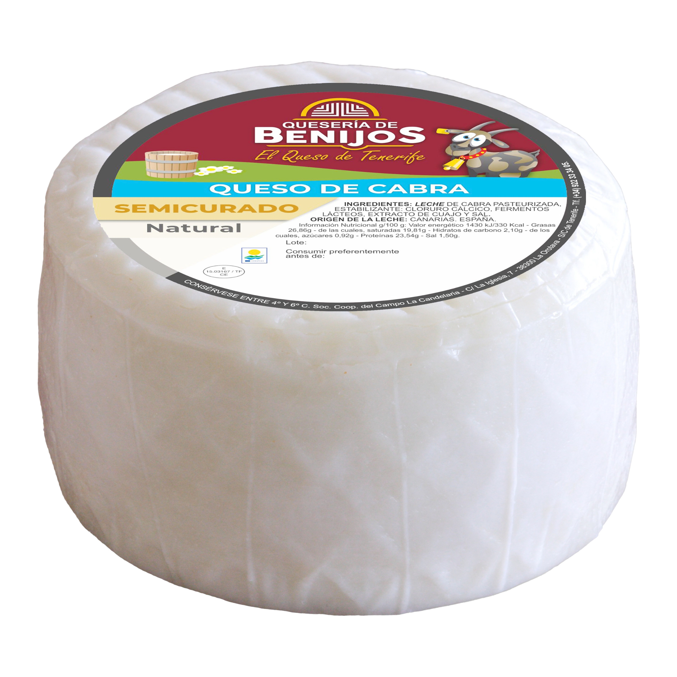 Queso de cabra sometido a proceso de maduración. De color marfilado y sabor característico a queso de cabra semicurado, es idóneo para acompañar preparaciones o incluso para degustarlo sólo.
