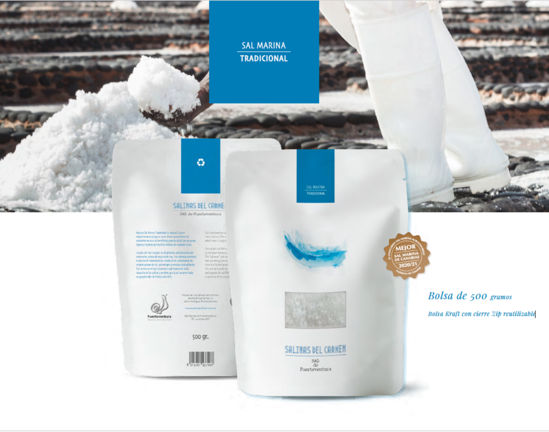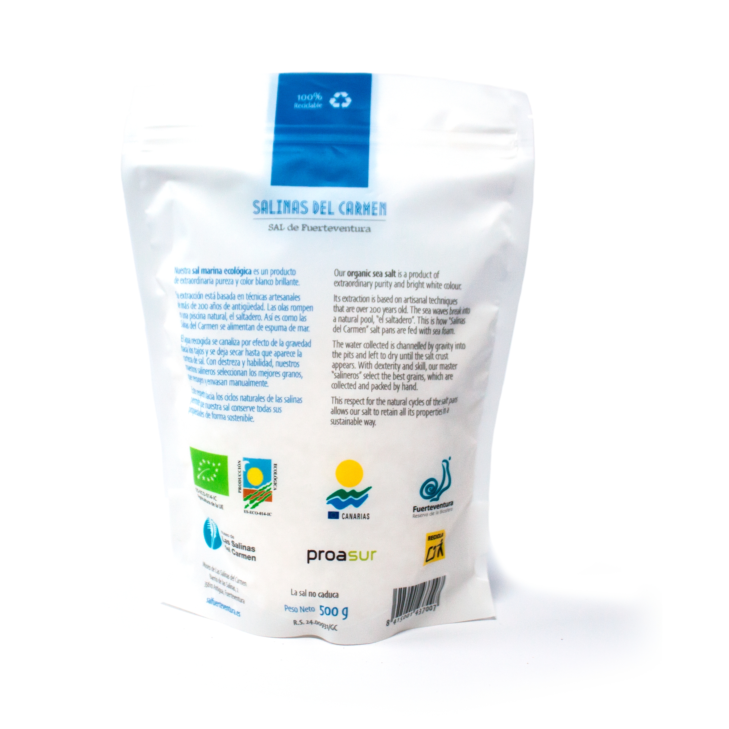 Sal marina ecológica obtenida siguiendo el sistema artesanal propio de las Salinas del Carmen. Se presenta en bolsa Kraft de 500 gramos con cierre zip. El producto conserva su estado natural, sin refinado ni aditivos, y mantiene los minerales característicos de la sal marina del entorno.